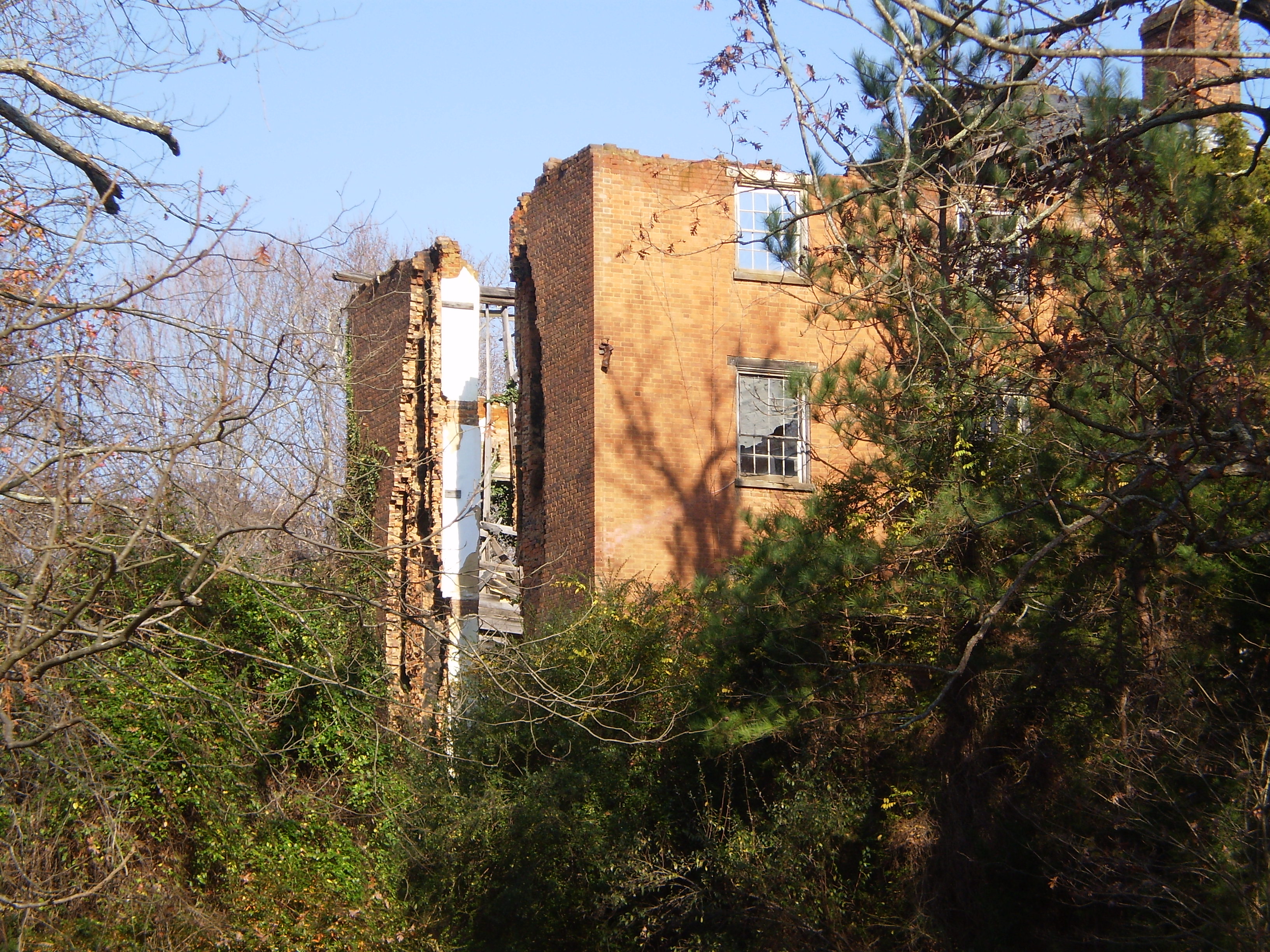 So I, of course, am interested in what's left over in Boydton–a beautiful town near the North Carolina line. It's the county seat of Mecklenberg County. Alas, the sad answer is not much of the main building of RMC survives. As recently as 2003, the main building of the antebellum RMC (Centre Hall) still had a roof. Here's a very nice website with pictures of the building and other surrounding buildings, including the president's mansion–which still stands along Highway 58.