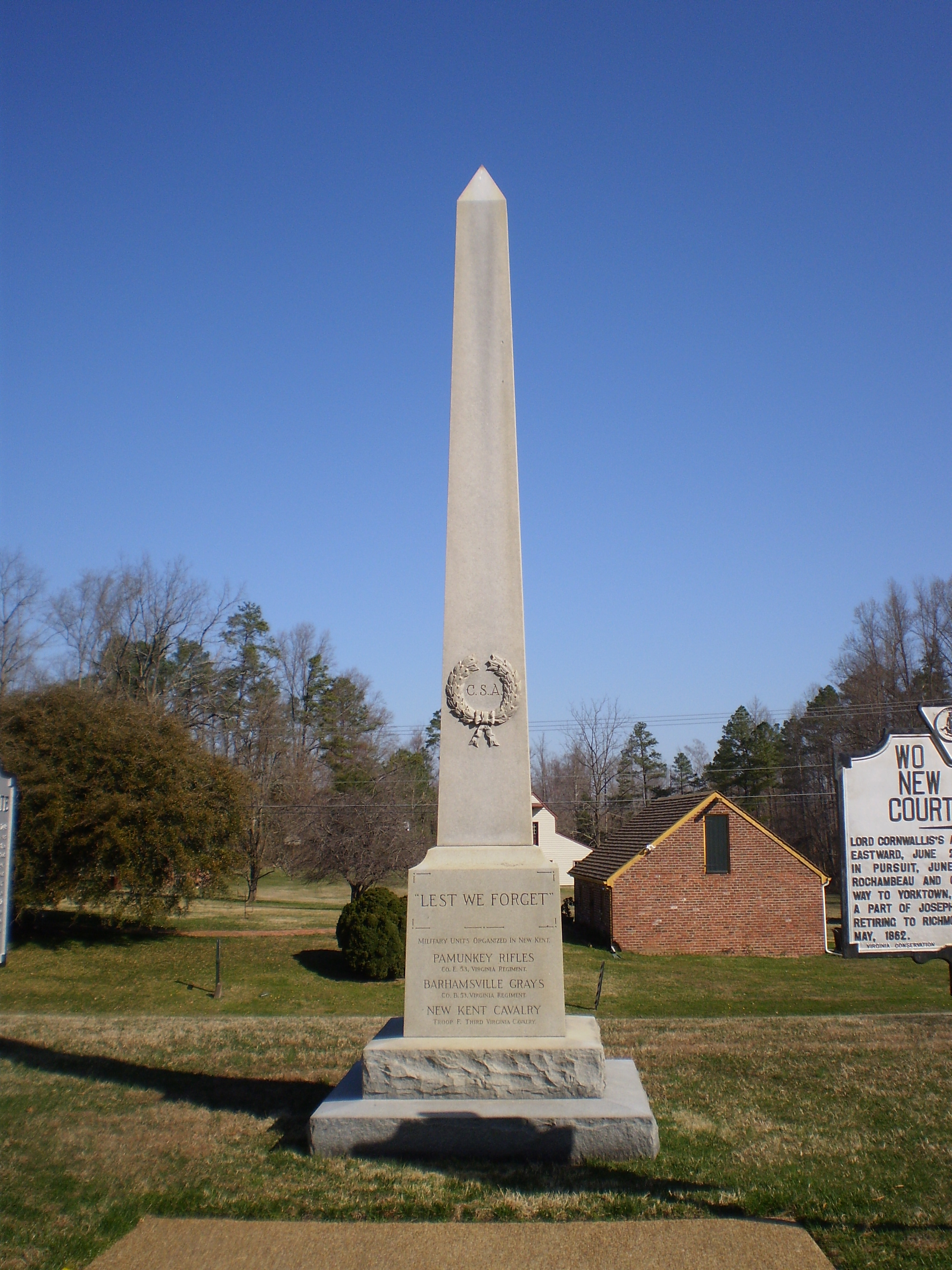 I came home via Richmond, because I wanted to see some family friends there. That gave me a chance to stop by New Kent County Courthouse (sort of on the way). Guess what's on the lawn out from the courthouse? There's a picture of it at the right. Not the largest of the ones I've seen. And no soldier, just a granite obelisk. Hmmm, all of this makes me think that it would be a fun project in "quantitative monument history"–if this hasn't been done already–to correlate the size/grandness of Confederate monuments with the African American population, the white population, and the per capita wealth of the counties where the monuments were put up, around the time they were put up, 1900-1920. Size of the monument would be the dependent variable, obviously.