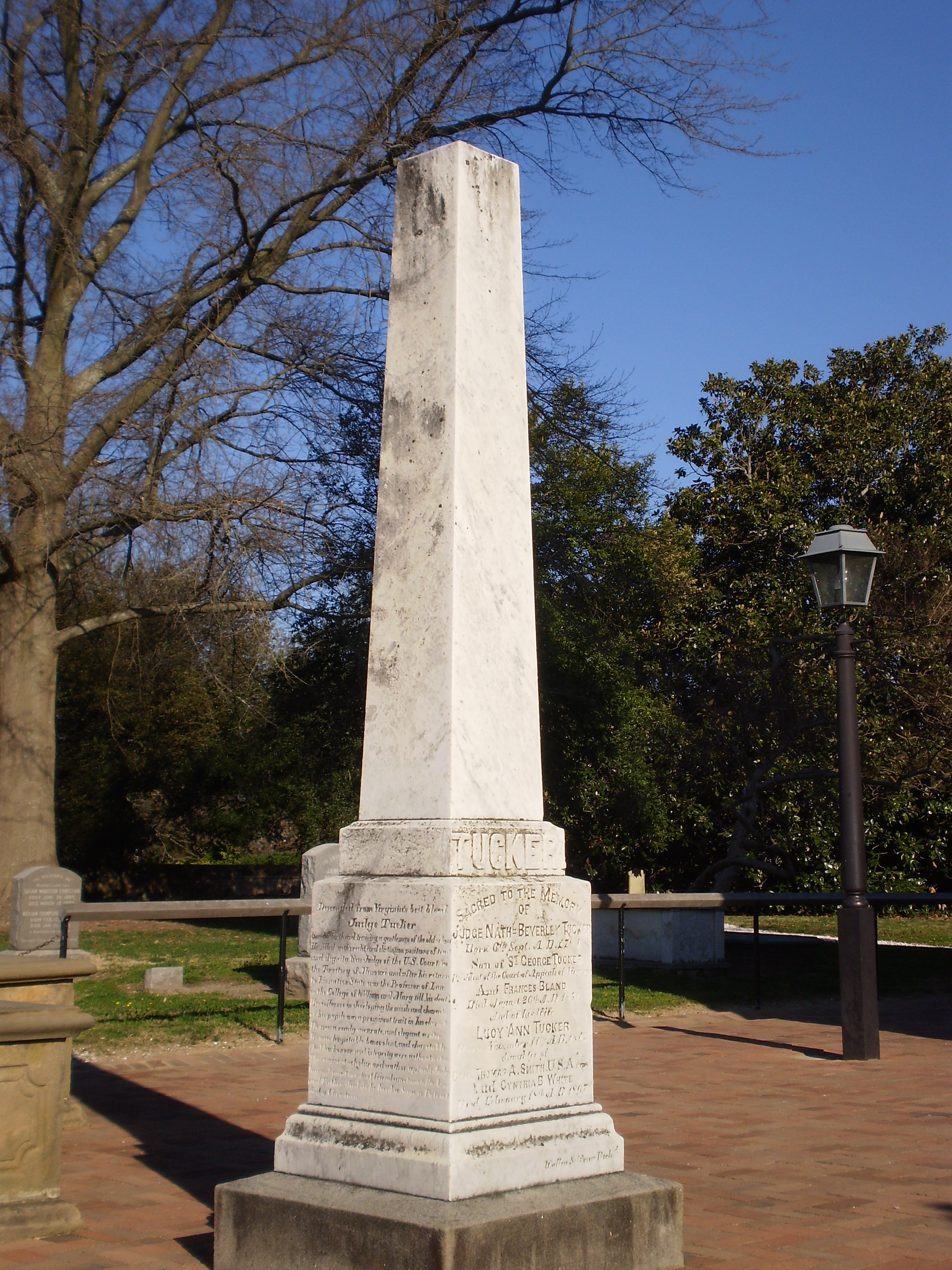 It's a mighty impressive structure today; you can imagine it in the eighteenth century. And since it's a church, of course there's a graveyard there. I had to start heading home before the church yard opened on Saturday morning, so what I have is a picture (at the top on the right) I took while looking over the brick fence. But get this — it's a monument to one of the people I study: Beverly Tucker. In fact, Professor Tucker sets in motion University, Court, and Slave.