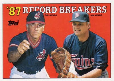 Pictured: Card #5 in the Topps 1988 set, featuring knucklers Phil and Joe Niekro. Phil is in the Hall, compiling a career record of 318-274 with an ERA of 3.35 over a 24-year career. Brother Joe (not in the Hall) compiled a career record of 221-204 with an ERA of 3.59 over a 22-year career. Their victory total gives them a ten-win edge over Gaylord and Jim Perry. Like the Niekros, only one of the Perry brothers is in the Hall. Unlike the Niekros (or any other siblings), each Perry won the Cy Young award at least once.