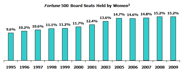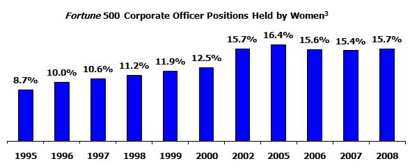 These numbers should not be terribly surprising, given the most recent Catalyst census of the Fortune 500 in 2009. Those figures show women holding about 15.2% of Fortune 500 board seats, 3% of Fortune 500 CEO positions, and 15.7% of Fortune 500 corporate officer positions. (Because larger companies tend to have more diverse boards, the slightly higher Calvert board figure is to be expected. See the charts from Catalyst included in this post showing the growth in these figures since 1995.)