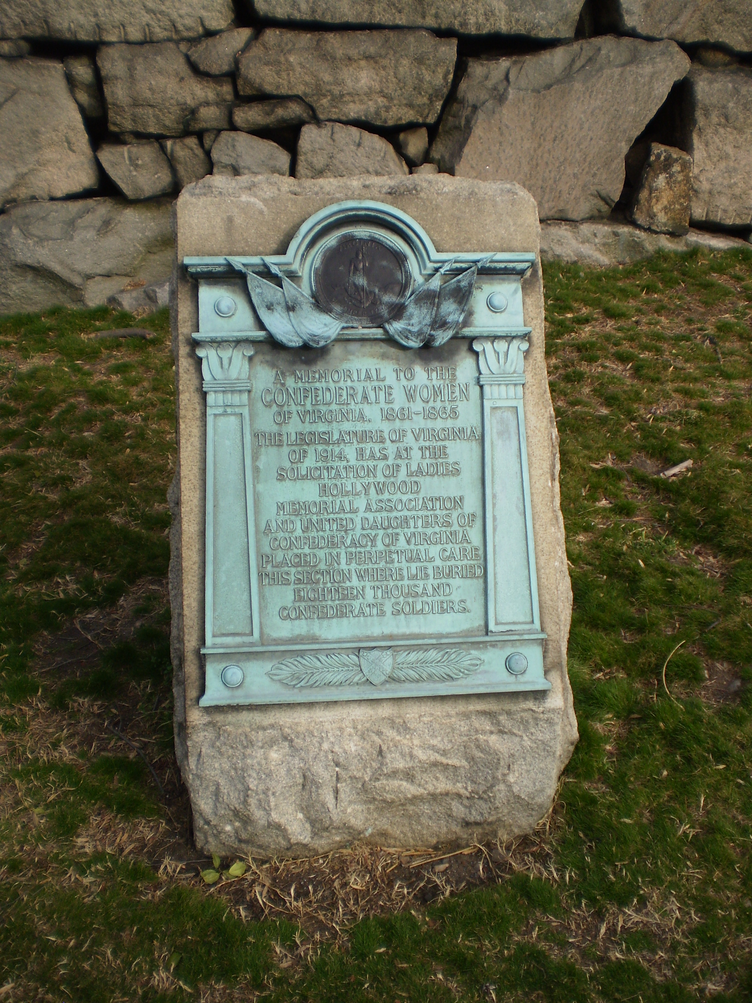 Update: I've added a picture of the plaque that I refer to in the comments. It now occurs to me that the Hollywood Cemetery might be able to get a heck of a lot of money from the state of Virginia each year, because of the statute that provides cemeteries with Confederate soldiers $5 per year per soldier. Or maybe that's what the plaque was all about — the state promising perpetual care in exchange for not providing funding to the UDC. One of these days this is worth investigating further.