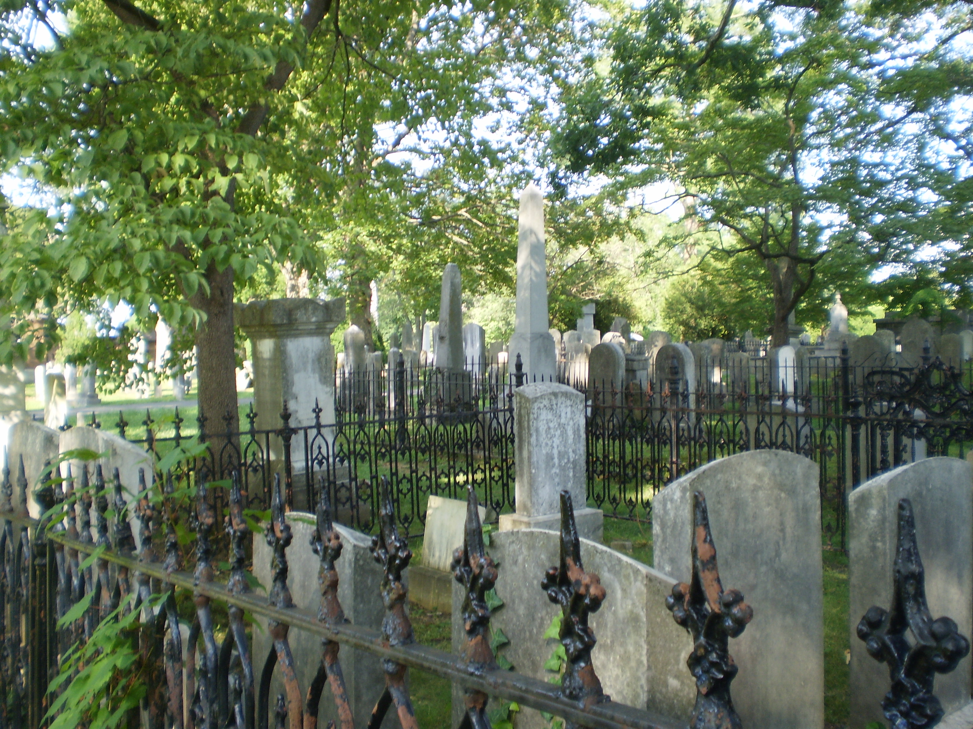 I want to talk a little bit about my visit to the Thomas Jackson cemetery in Lexington a couple of weeks back. Tons of interesting things to talk about here — beginning with the changing nature of the graves within the cemetery itself. It starts off as a typical early 19th century city cemetery — all the graves close together in orderly rows. But as you move through the cemetery, it becomes more like a rural cemetery — graves further apart, more variance in the kinds of monuments, fewer fences. In one place you can see the evolution of cemetery styles — that's true for a number of cemeteries (Raleigh's Oakwood Cemetery has some of this, but to get the full sense of evolution in Raleigh, you'd want to start with the Old Raleigh Cemetery). But I had this sense more than at any other cemetery where I have been while I was wandering the Jackson cemetery.