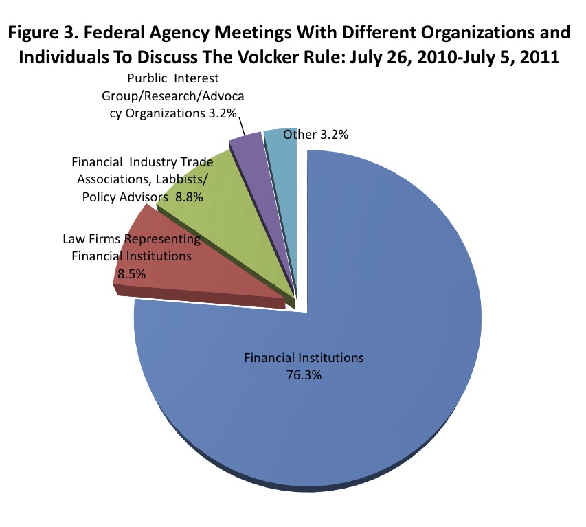 Whereas financial industry representatives met with federal agencies on the Volcker Rule a total of 265 times, meetings with entities or groups that might reasonably be expected to act as a counterweight to industry representatives in terms of the information provided and the types of interpretations pressed numbered only 18. This is roughly the same number of times that a single financial institution — JP Morgan Chase – met with federal agencies on Volcker Rule interpretation and implementation. As shown by Table 8 and Figure 3, financial institutions, financial industry trade groups, and law firms representing such institutions and trade groups collectively accounted for 93.64% of all federal agency Volcker rule meetings, whereas public interest, labor, research, and advocacy groups and other persons and organizations accounted for only 6.36%. Moreover, the quality of meetings with financial institution representatives exceeds that of other agency contacts on several measures.