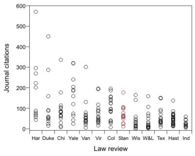 Another way of looking at this issue is to use citation data. As I wrote about a couple weeks back in the context of Theodore Eisenberg's and Martin Wells' latest on citations, a study of citations also has a lot of problems. But if we would just suspend objections for a moment, I want to talk about a simple study I published a few years back, which looked at citations to articles in a thirteen leading law journals over a 15 year period. The study found that many articles in our nation's most elite journals did substantially less well than articles published in very good, even if not the most elite journals. There are a lot of things to be said about this — including that, wow, there's not a lot of space in those journals and some articles do great — absolutely fantastic in citations — but a lot don't. But I think it also suggests that a lot of judgements, even by editors of the best journals, may not be the best decisions they could have made. This is hindsight — and it poses all kinds of problems related to field bias in citations — but it also reminds us that some articles in the best journals may not be as good as many other articles published in other journals. And I think that's an important caveat, especially this time of year as hiring and promotion and tenure committees are gearing up.