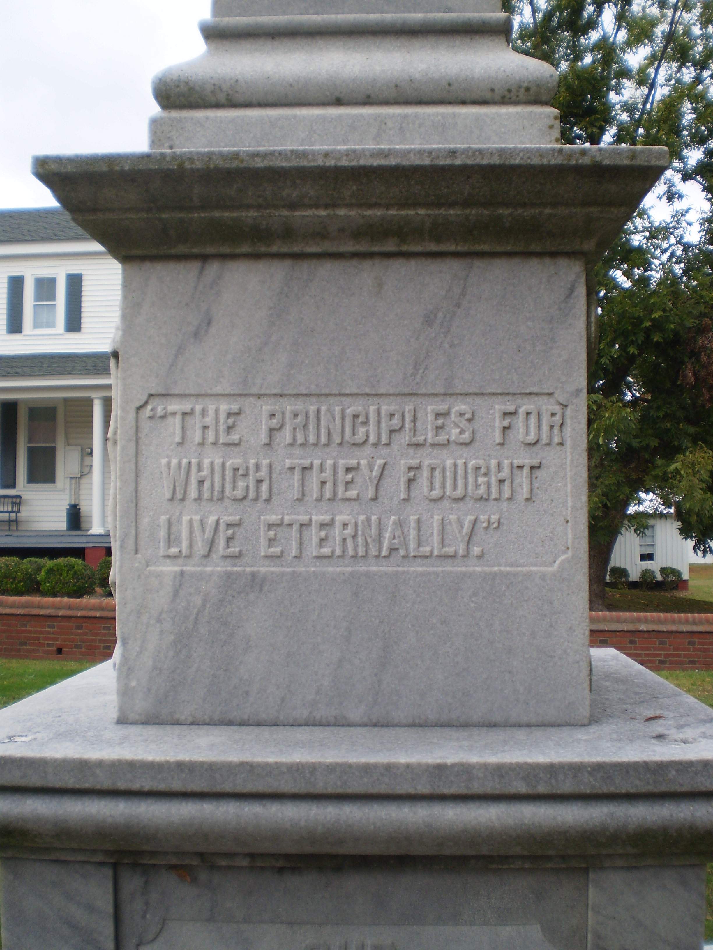 And in particular I want to focus on the inscription in the front, "The principles for which they fought live eternally." This is in some tension with a monument at Appomattox Court House, whose monument speaks of "principles believed fundamental." Maybe I make too much out of the past tense on the Appomattox monument — but certainly the Sussex monument is stark in its support of the principles of the war. And here's a picture of the entire monument with the courthouse in the background.