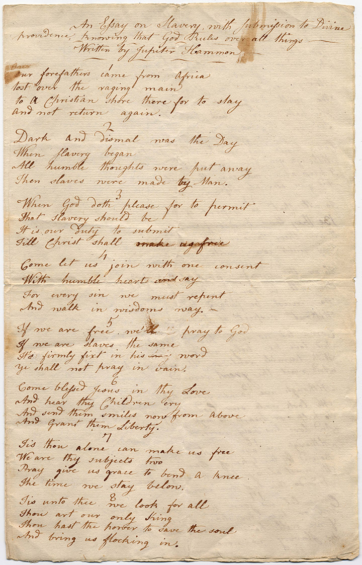 A poem about slavery written by the country's first published African-American writer, Jupiter Hammon, who was himself a slave, has been discovered by a University of Texas at Arlington doctoral student. The poem criticizes slavery and pleads with God to end it. More information is available here.