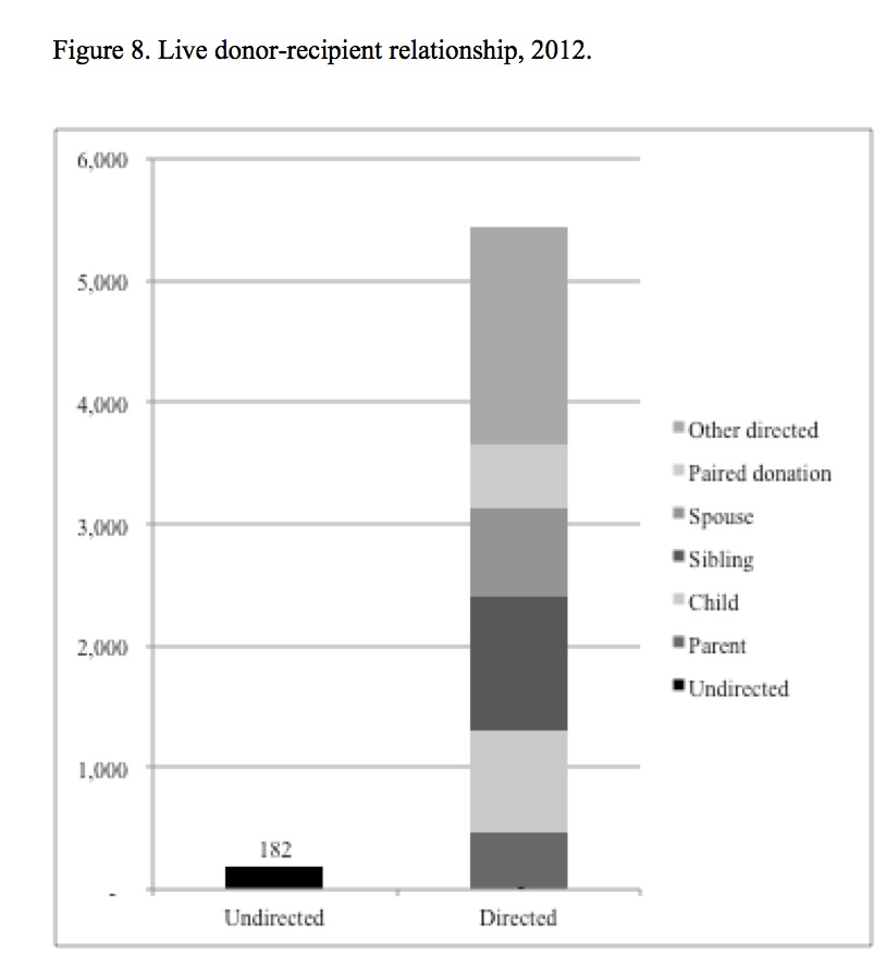 Moreover, an increase in the number of living kidney donors would improve health outcomes for those with ESRD and reduce the annual cost per patient, while imposing relatively little donor risk. However, as shown above right (figure 8 from our paper), living kidney donations are currently nearly all directed, usually to family members. Perhaps with sufficient education and public outreach the number of altruistic donors could be increased. But the fact that there were only 182 nondirected donors in 2012, combined with the recent downward trend in living donations – despite current education and outreach efforts – are not encouraging in that regard. It is for all of these reasons that so many observers, including Becker and Elias, conclude that the time is ripe to reconsider financial incentives for kidney donation.