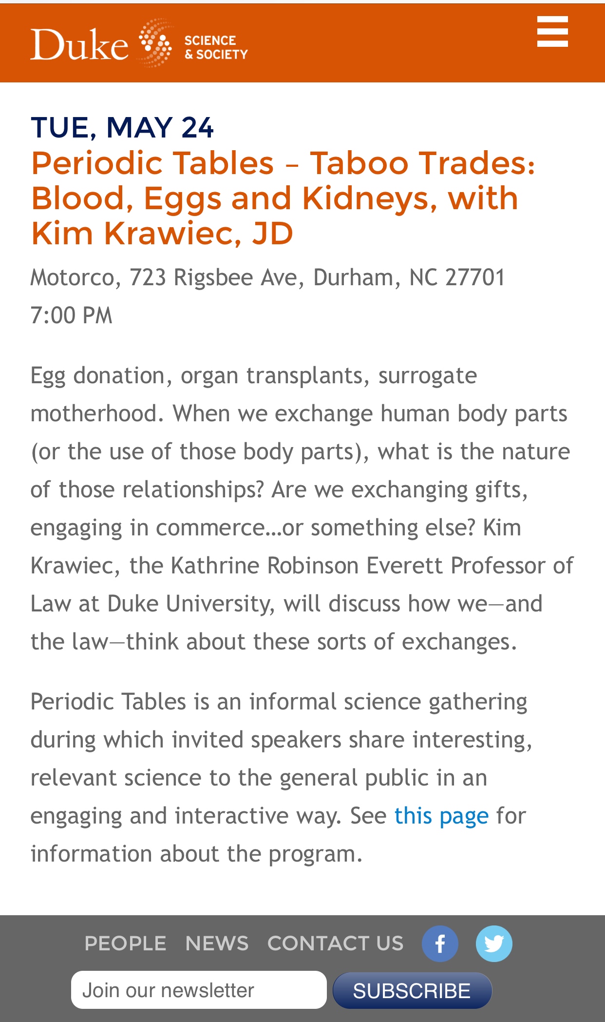 Periodic Tables, May 24 – Taboo Trades: Blood, Eggs, and Kidneys Posted by Kim Krawiec May 21, 20162 I’ll be giving a “Periodic Tables” talk on Tuesday, May 24 at Motorco in Durham, so folks in the Triangle area should feel free to stop by. I’ll be discussing “Taboo Trades,” including blood, eggs, and kidneys. Hope to see some of you there!