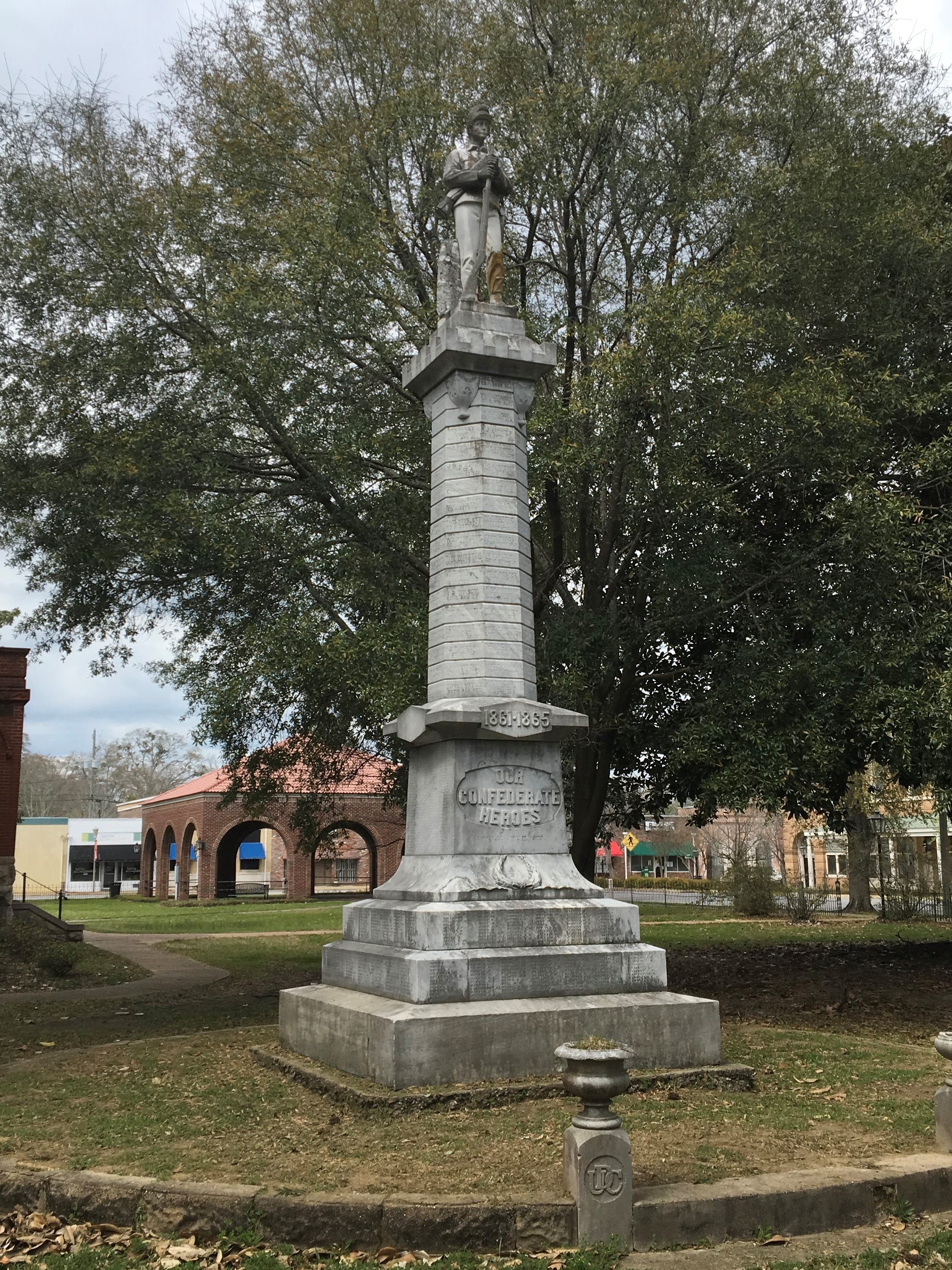 Since it's been just about forever since we had a courthouse trivia question I thought this morning that I'd go out and take some courthouse photos. I've had my eye on this courthouse (which was built in the early 20th century) for a long time and I knew there was a Confederate monument in front of it, so I figured, this would be a good one to visit. The courthouse was completed around the same time that Alabama moved aggressively to limit African American voting. And in fact it turns out that the Confederate monument in front of the courthouse was put up shortly after the courthouse was finished — so perhaps it joins a celebration of the Confederacy with the new courthouse. This turns Faulkner's observation in Requiem for a Nun around somewhat. In that where Faulkner depicted his community as (largely) moving on from the Confederacy, more concerned with monuments to the Spanish-American war or to commerce than to the Confederacy. Though that could be said for just about all early 20th century Confederate monuments, I suppose. Also significant, I think, is that the Confederate monument is different from many I've seen, in that it has the names of all (so far as I can tell) of the Confederate soldiers and sailors from the county on it, rather than just a subset — like the officers. No incorporation of names by reference here, as happens at the Sussex County, Virginia, monument and in the plaque honoring Washington College alums who fought for the Confederacy, at the Washington and Lee Chapel. So shall we start with the question: where is this courthouse? And then after the fold I'll talk a little more about the monument.