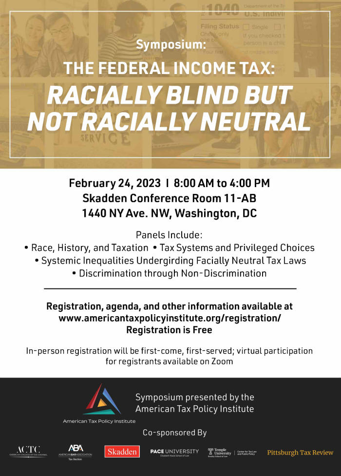 Symposium Announcement—The Federal Income Tax: Racially Blind but Not Racially Neutral Posted by Bridget J. Crawford January 20, 2023No Comments